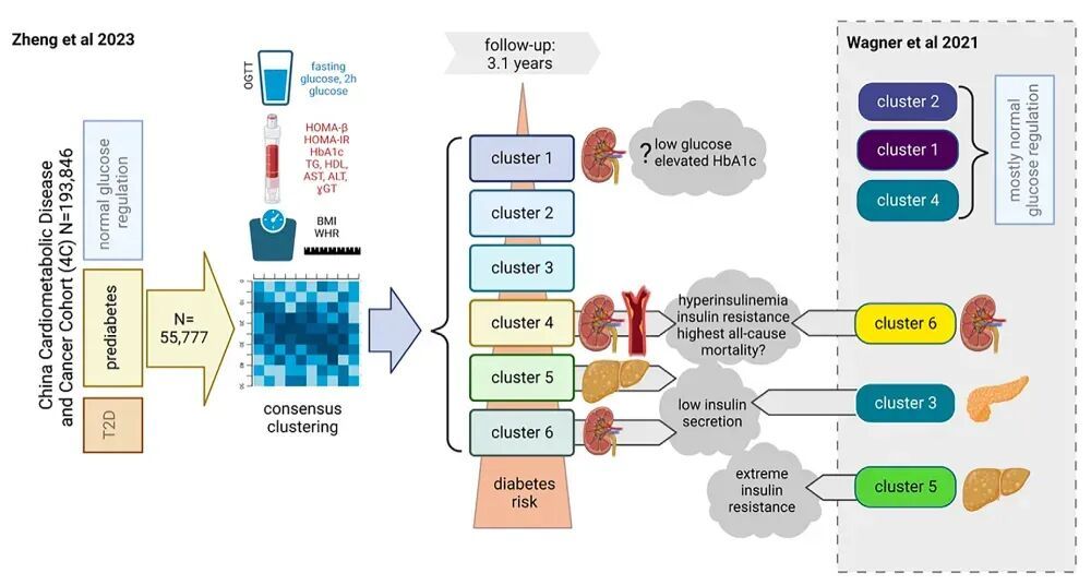 与此同时,大规模人群研究发现,糖尿病前期并不是一个单一群体,而是由不同的代谢亚型构成:有些人因胰岛素分泌不足而出现血糖异常,有些人则是由于明显的胰岛素抵抗。这些亚型不仅决定了糖尿病的进展风险,还与慢性肾病和心血管病的发生有关[3]。